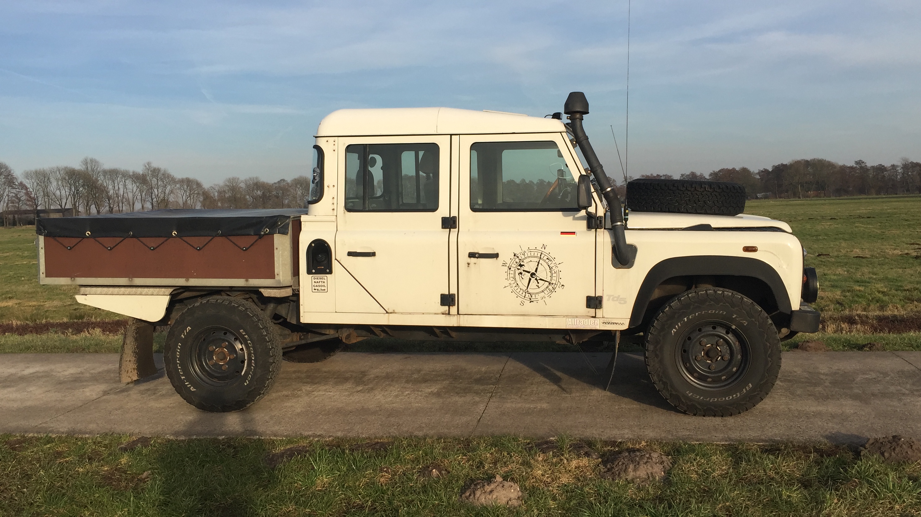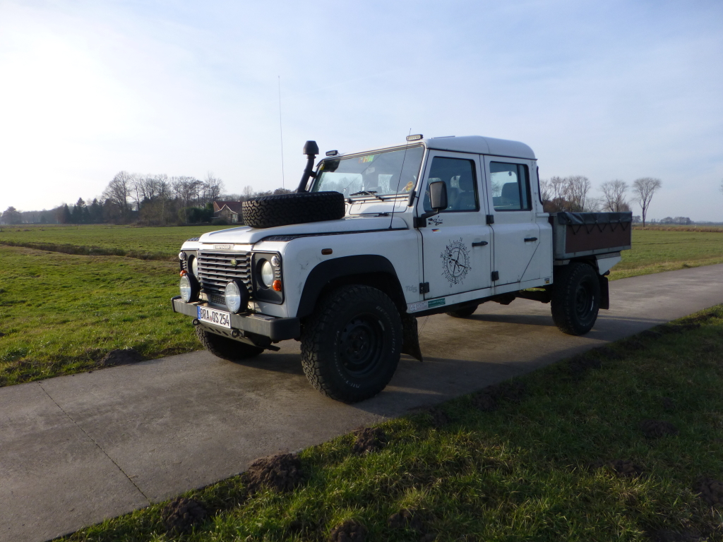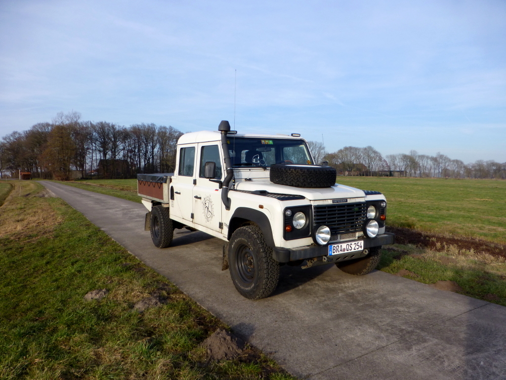 Der Vorgänger hat eine Spurverbreiterung eingebaut, die den Landy bulliger wirken lässt. Es ist vorn außerdem ein Unterfahrschutz montiert. Da der Vorbesitzer einen WoMo-Aufbau anstatt der Ladefläche montiert hatte, passte die Original-Blechwanne nicht mehr und er hat aus L-Stahl und Anhängersperrholz eine sehr professionelle Ersatzladefläche gebaut. Das macht meinen 130er ein wenig zu einem Unikat.